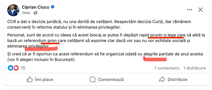 Ciprian Ciucu a notat în postarea sa pe Facebook că: „CCR a dat o decizie juridică, nu una dorită de cetățeni. Respectăm decizia Curții, dar rămânem consecvenți în ceea ce privește reforma statului și eliminarea privilegiilor”.