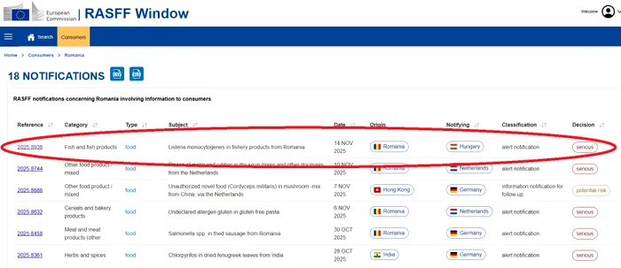 În 14 noiembrie a fost emisă o avertizare la nivel european cu privire la pericolul infestării cu Listeria a mai multor produse provenite din România. Este vorba despre somon, în mai multe reţete, fructe de mare şi creveţi. Riscul este unul major, lucru subliniat şi de reprezentanții Comisiei Europene.
