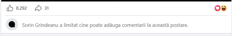 Nu am putut analiza comentariile de la postările lui Sorin Grindeanu, deoarece ele nu sunt publice – șeful PSD a limitat această opțiune pentru toate postările sale din ultimele săptămâni – nimeni nu poate comenta la postările sale fără aprobarea persoanei care gestionează contul. Nici numărul total, nici comentariile propriu-zise nu pot fi observate.