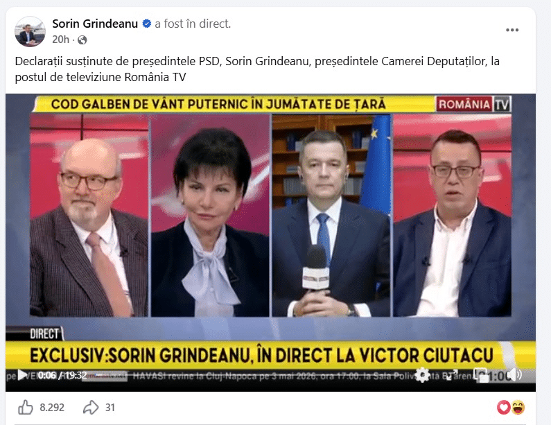 Prin comparație, cea mai virală postare a lui Grindeanu, un clip cu declarațiile sale pentru postul România TV, are puțin peste 8.000 de reacții. Altfel spus, media reacțiilor la postările lui Bolojan din ultimele 2 zile este de aproape 40.000, de peste 4 ori mai mare decât apogeul atins de Grindeanu.