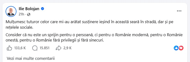 În speță similară, contul lui Ilie Bolojan a publicat și datele despre tipurile de reacții ale internauților la postările la postările sale – majoritatea covârșitoare a acestora sunt pozitive pentru toate postările. De pildă, dintre cele 133.000 de reacții strânse de mesajul său de mulțumire, peste 130.000 sunt like-uri și emoji-uri în formă de inimă.