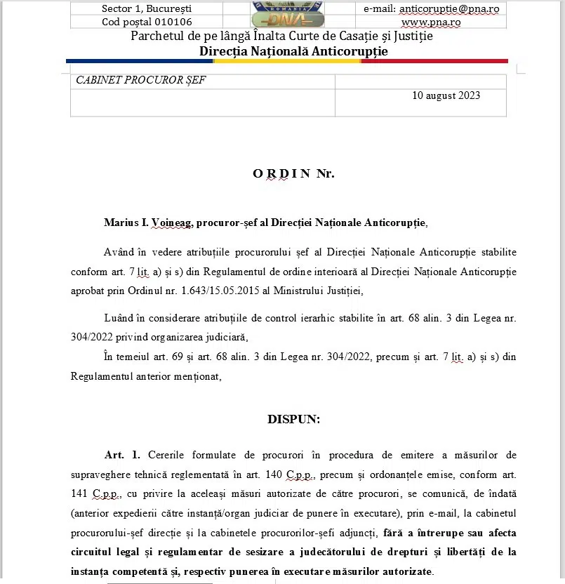 Reamintim opiniei publice că procurorul șef DNA, Marius Voineag, a dispus, printr-un ordin intern emis la data de 10 august a.c., că toate măsurile de supraveghere tehnică solicitate de procurori să fie comunicate ”de îndată”, prin email, conducerii DNA, mai exact la cabinetul procurorului-șef și la cabinetele procurorilor-șefi adjuncți, fiind indicate adresele de mail ale lui Marius Voineag, Tatiana Toader și Paul Dumitriu.