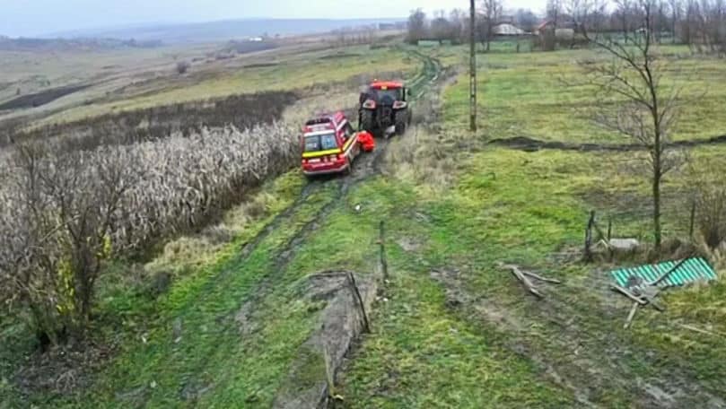 S-a întâmplat în comuna Corlăteni, unde o ambulanță blocată pe un drum neasfaltat a fost trasă cu tractorul până la pacient.