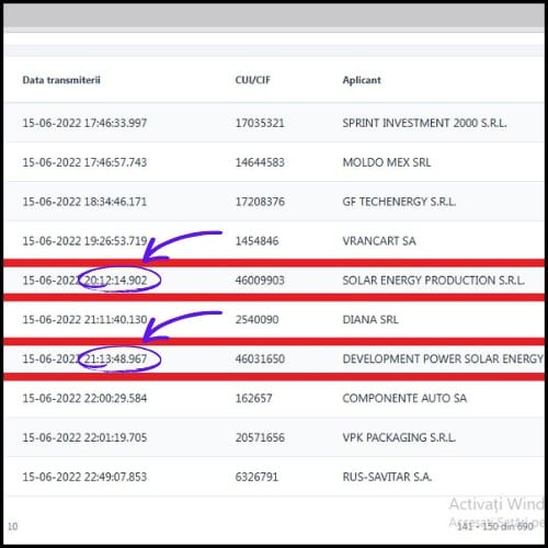 Solar Energy Production și Development Power Solar Energy au depus în aceeași zi cereri de finanțare prin PNRR (15 iunie 2022), la diferență de o oră una de alta (FOTO).