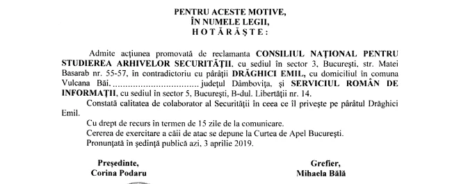 CNSAS i-a constatat lui Emil Drăghici calitatea de colaborator al fostului aparat represiv din perioada comunistă de dinainte de 1989, iar instanța a stabilit că acesta a colaborat cu Securitatea.