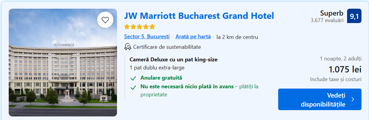 Concret, cea mai ieftină cameră la hotelul JW Marriott costă 1.075 de lei pe noapte în data în care s-a organizat evenimentul, arată datele de pe platforma Booking.