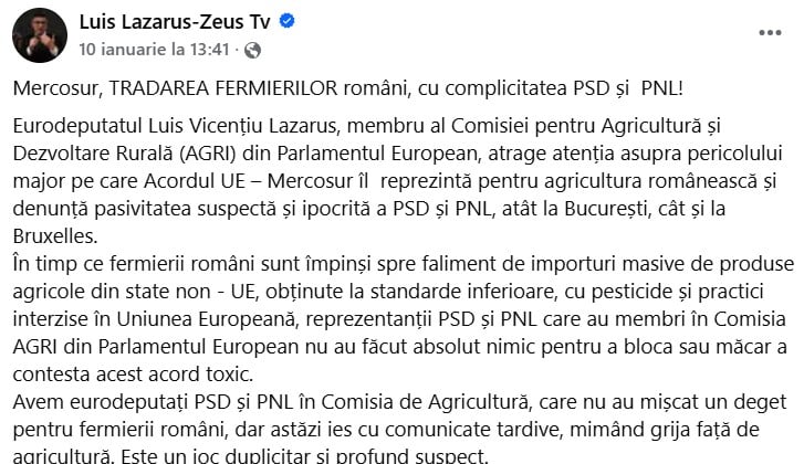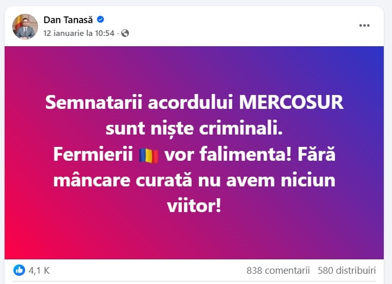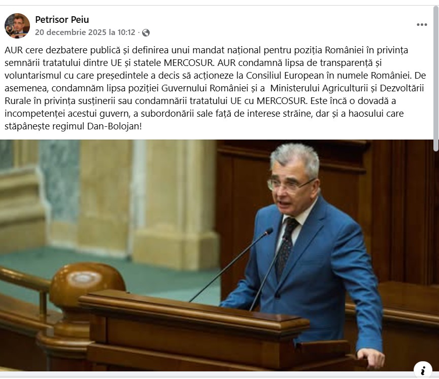 Postarea a venit la câteva săptămâni după ce liderul putinist a afirmat,, într-un clip video postat pe Facebook, că “semnarea și angajarea României în acordul Mercosur înseamnă distrugerea agricultorilor”. El a enumerat susținerea acordului într-o serie de alte decizii făcute “în dispreț și împotriva românilor”, printre care noul acord cu OMV și o “nouă rată de împrumut de 4 miliarde euro pentru Ucraina”.