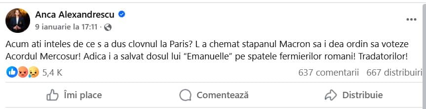 Această narațiune a fost preluată de unii dintre cei mai importanți și vizibili susținători ai polului suveranist, inclusiv din presă, cum ar fi Anca Alexandrescu, moderatoarea Realitatea Plus care a candidat în 2025 la primăria București cu susținerea AUR. Într-o postare cu peste 5.000 de reacții pe Facebook, ea a afirmat că vizita președintelui României la Paris a fost un pretext pentru ca “stăpânul Macron” să îi poată ordona să voteze în favoarea acordului