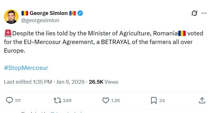 România lui Nicușor Dan și Ilie Bolojan a votat „pentru” acordul MERCOSUR. Decizia lovește direct suveranitatea alimentară și sacrifică fermierii români în favoarea importurilor. AUR denunță această decizie drept un abandon național și o trădare a agriculturii românești!