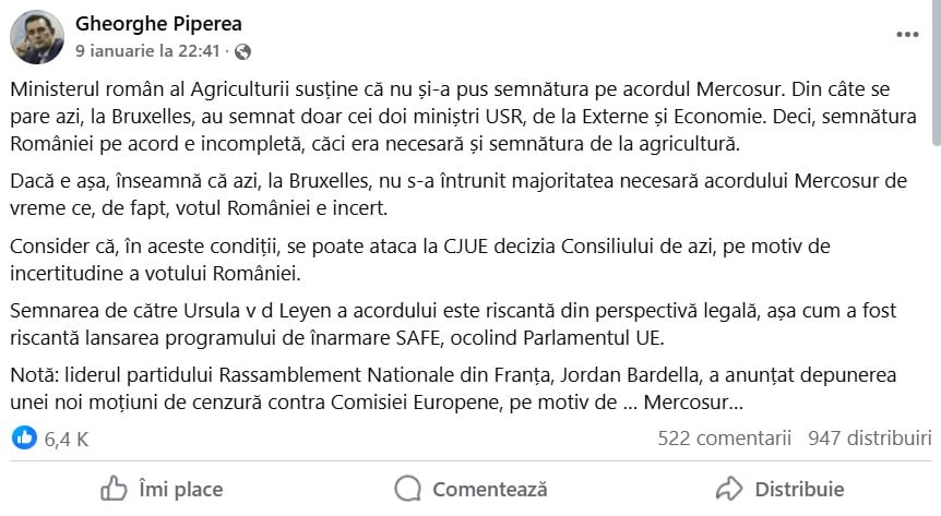 În spațiul putinist a apărut, însă, o altă teorie după ce acordul a fost supus votului în Consiliul UE. Imediat după votul de la început de ianuarie, europarlamentarul AUR Gheorghe Piperea, avocatul devenit celebru tocmai pentru teoriile conspirației pe care le ventilează masiv în spațiul public, a declarat pe rețelele de socializare că lipsa semnăturii ministrului Agriculturii face votul României “incert”, iar decizia Consiliului poate fi atacată la Curtea de Justiție a Uniunii Europene în această bază.