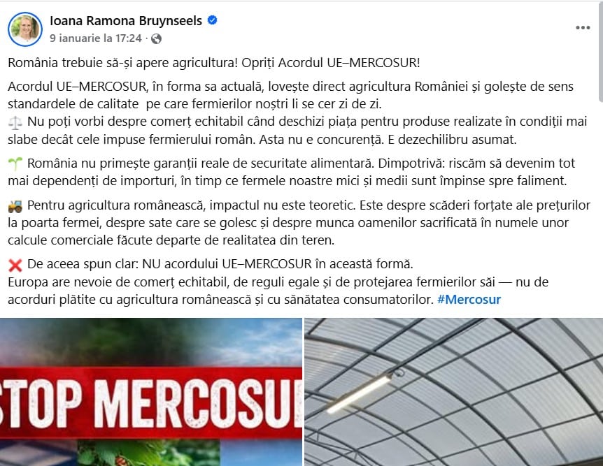 În ultima săptămână, reprezentanții partidelor putiniste din România, în principal AUR, SOS și POT și influencerii care îi susțin în spațiul online, au ignorat în mare parte aceste detalii în timp ce au creionat o imagine aproape cataclismică a efectelor acordului pentru România, în condițiile în care valoarea importurilor românești din Mercosur este de puțin peste 400  milioane de euro pe an, conform ultimelor date ale Comisiei Europene – adică în jur de 0,3% din valoarea importurilor de 119.9 miliarde de euro ale României pentru perioada ianuarie-noiembrie 2025, potrivit Institutului Național de Statistică.