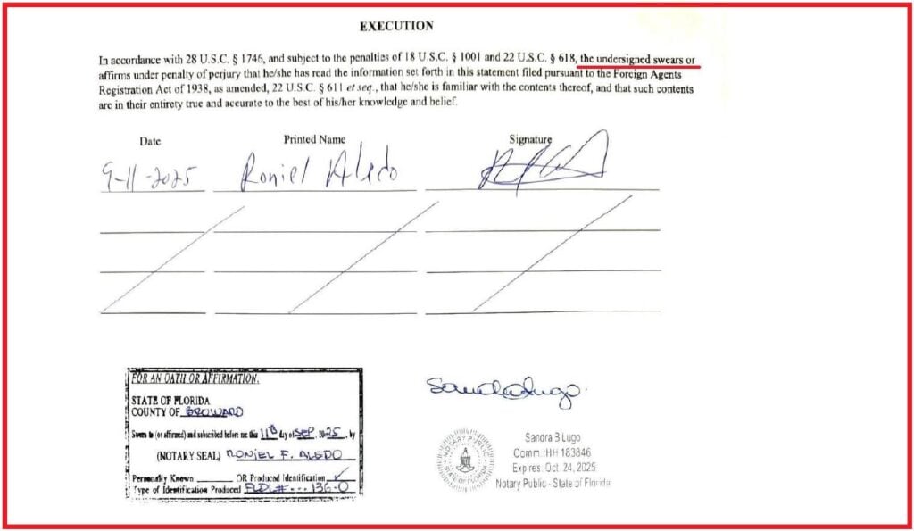 Un amănunt important care a scăpat atenției generale legat de cazul Birchall este că Roniel Aledo a autentificat la un notar in Statele Unite formularul pe care l-a depus la Departamentul de Justiție din SUA.