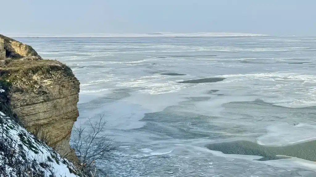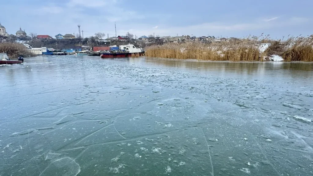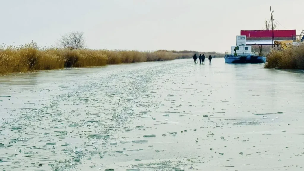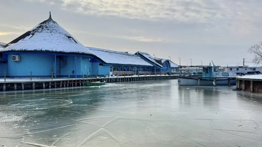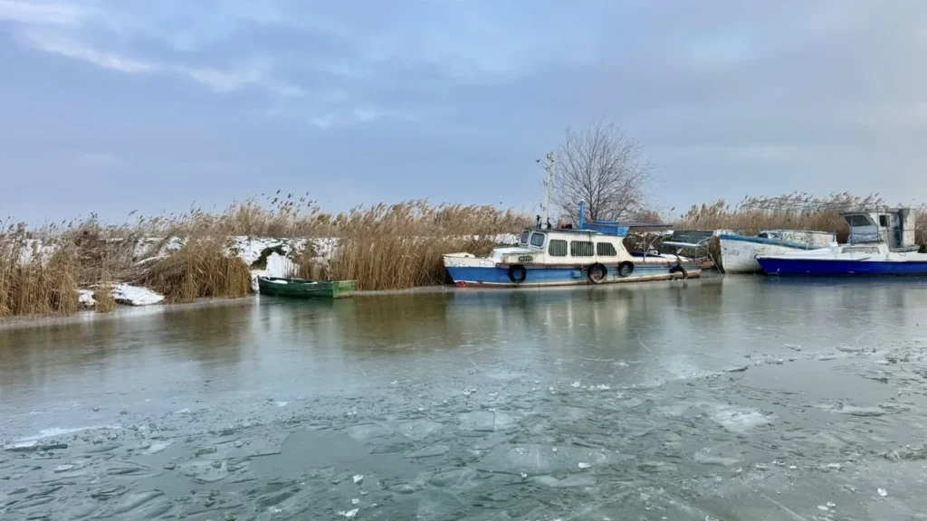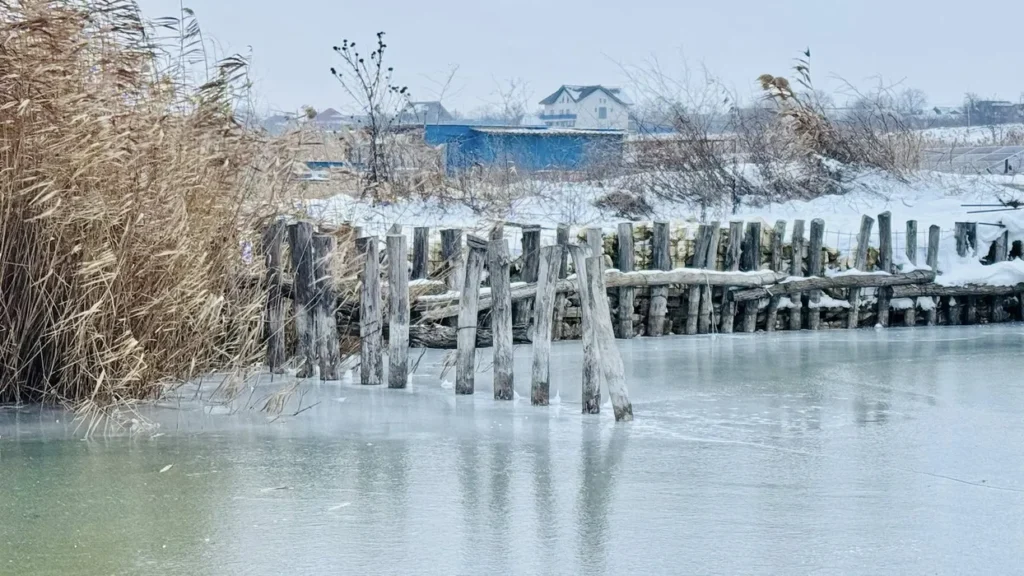 După mai multe zile și nopți geroase în Dobrogea, cel mai mare lac din România a înghețat, la fel ca și canalele din jurul Jurilovcăi, satul tulcean de pe malul acestui lac.