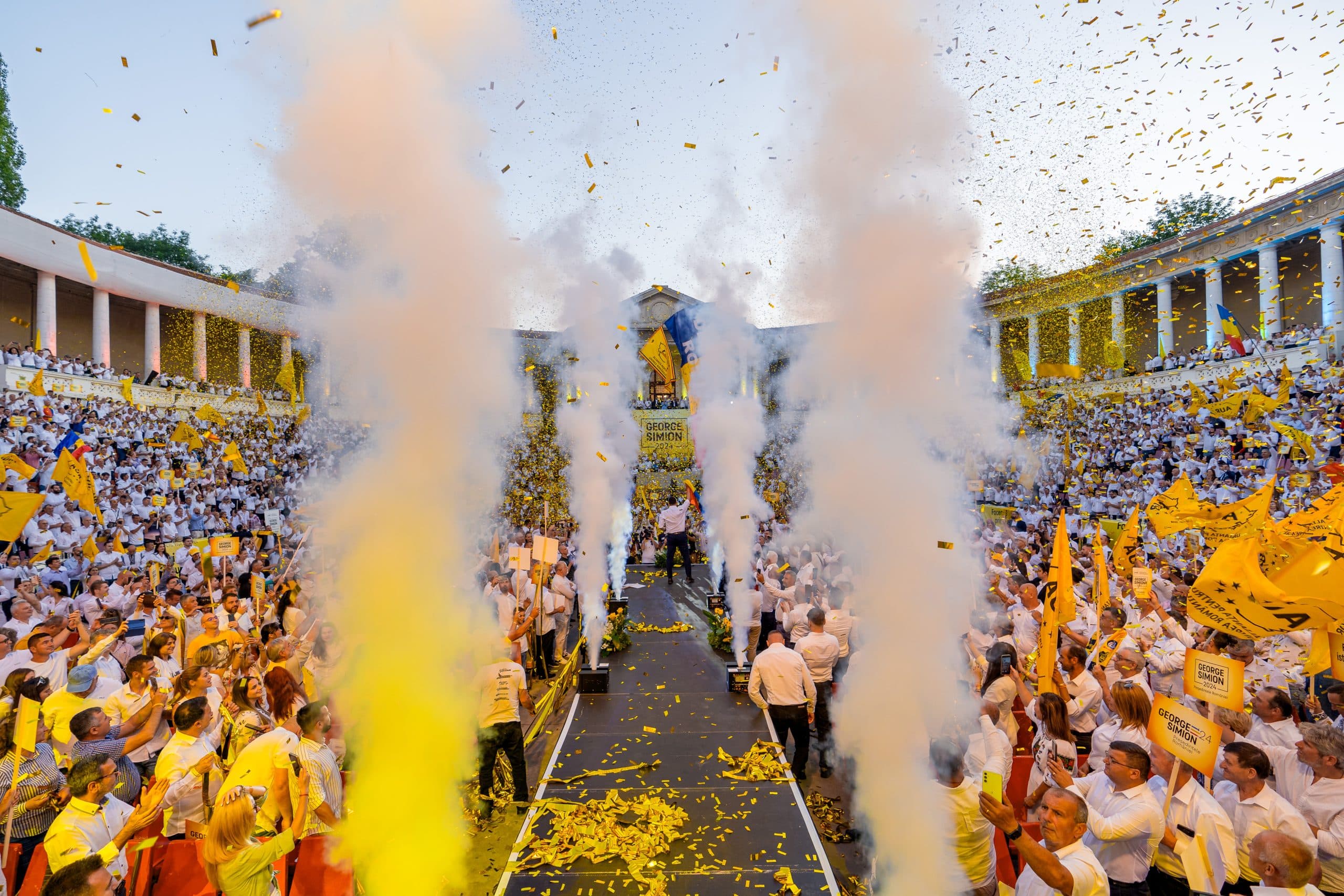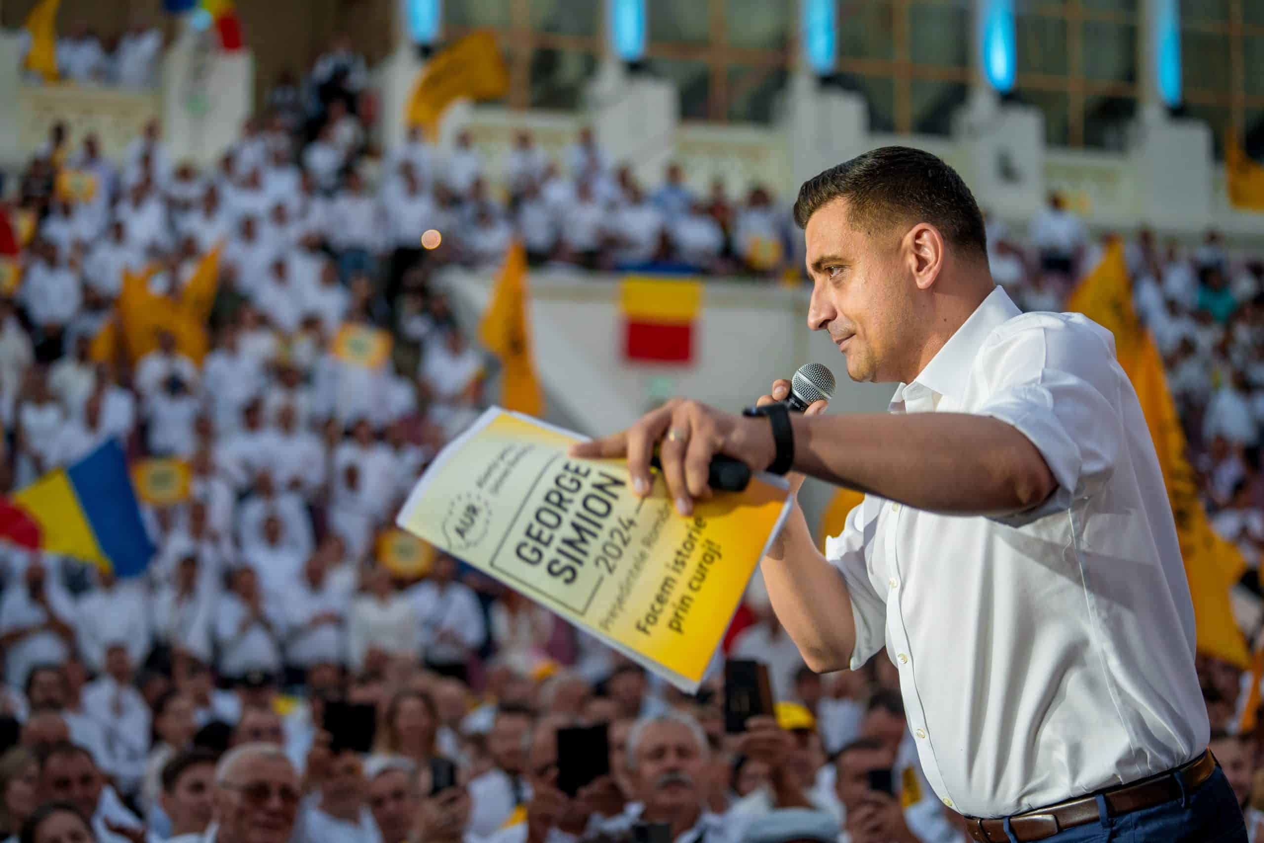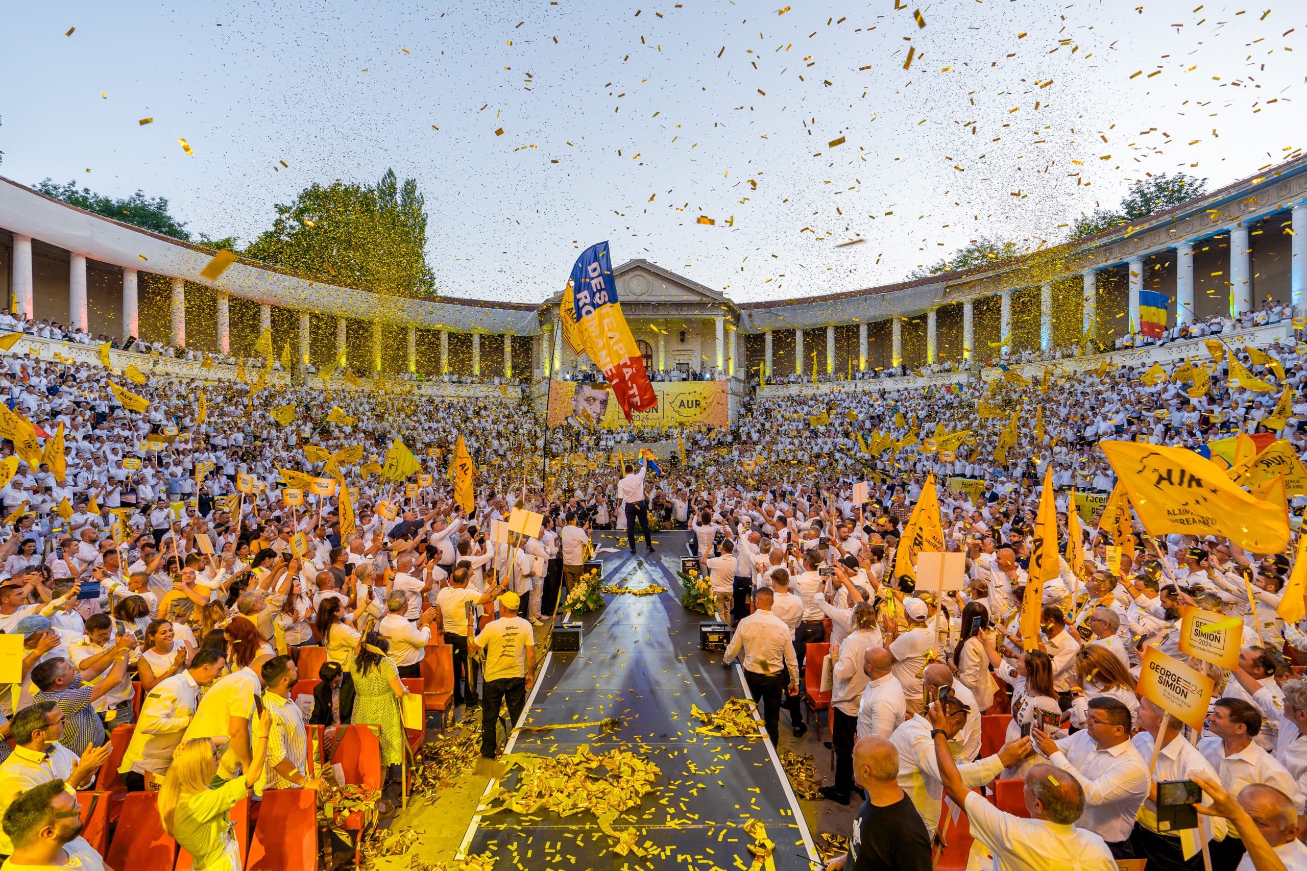 Alianța pentru Unirea Românilor și-a lansat sâmbătă, 15 iunie, candidatul la alegerile prezidențiale, în persoana lui George Simion. Evenimentul a avut loc la Arenele Romane, în prezența a peste 7.000 de membri și simpatizanți AUR.