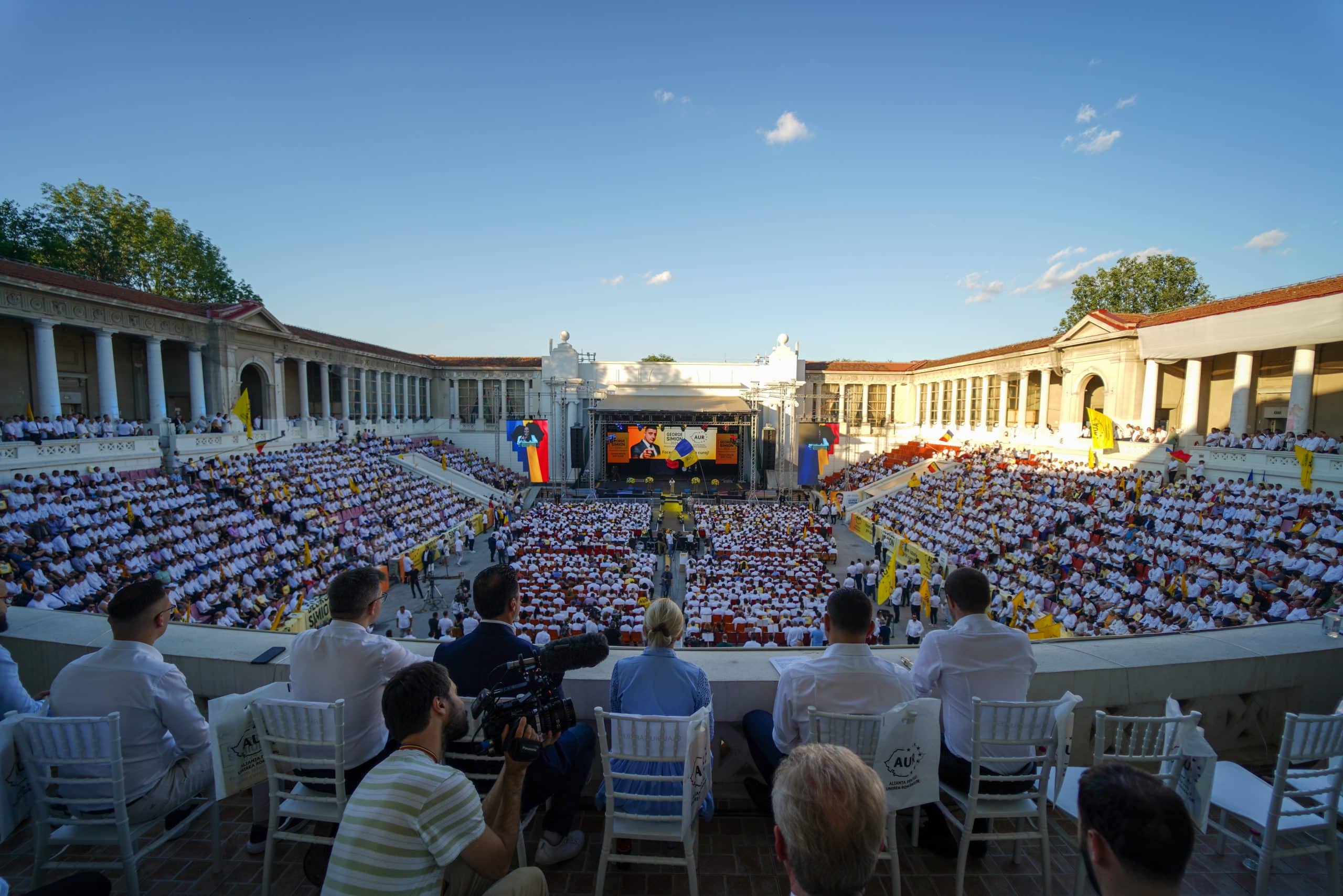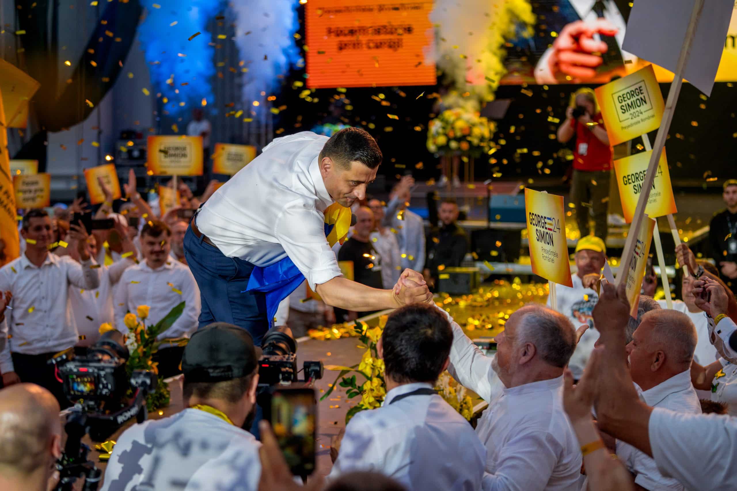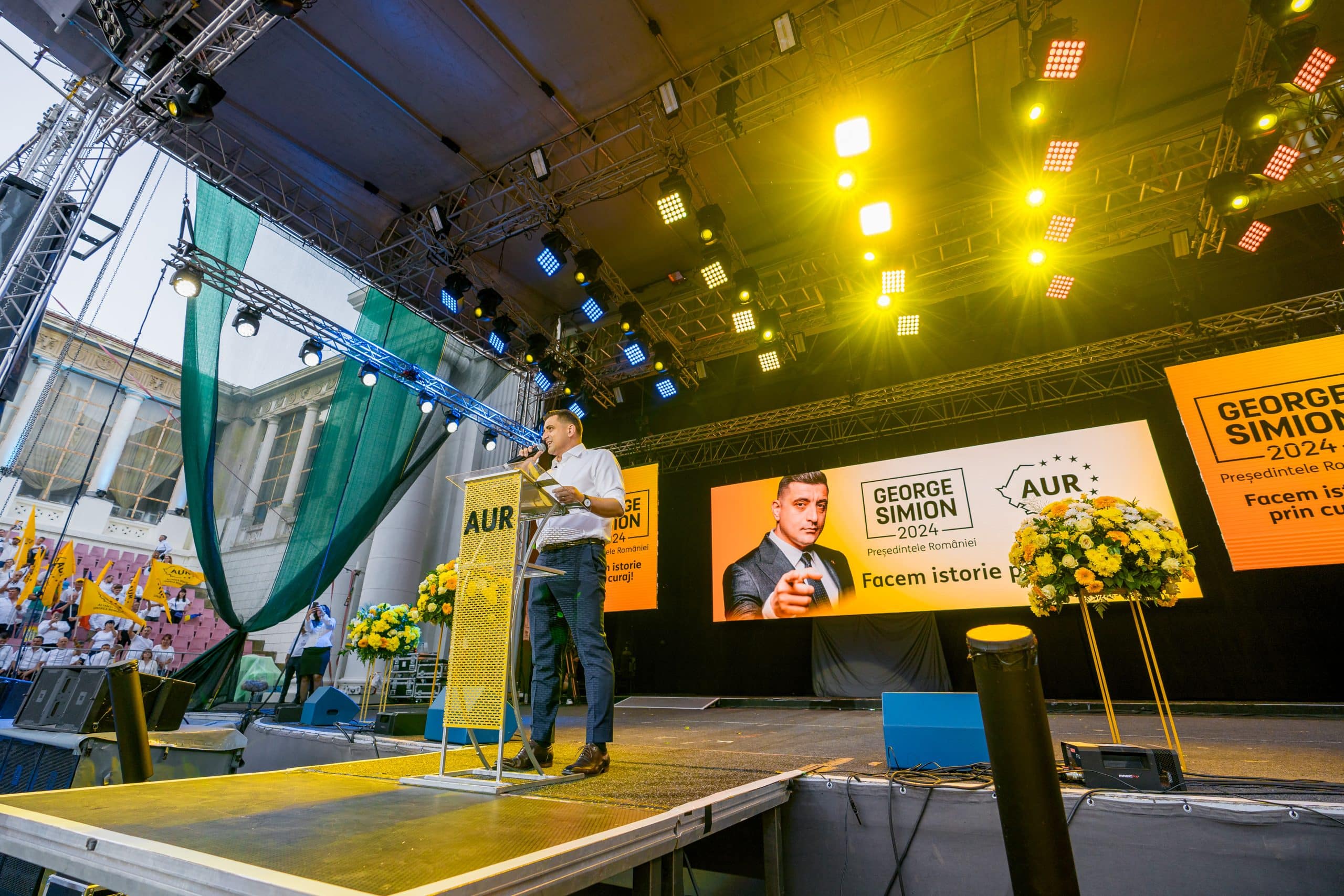Alianța pentru Unirea Românilor și-a lansat sâmbătă, 15 iunie, candidatul la alegerile prezidențiale, în persoana lui George Simion. Evenimentul a avut loc la Arenele Romane, în prezența a peste 7.000 de membri și simpatizanți AUR.