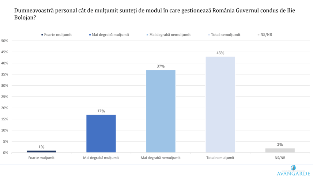 Guvernul Bolojan intră în picaj total la capitolul încredere. În ceea ce privește aprecierea față de Guvernul condus de Ilie Bolojan, 43% dintre respondenți se declară „total nemulțumiți”, iar 37% spun că sunt „mai degrabă nemulțumiți”.