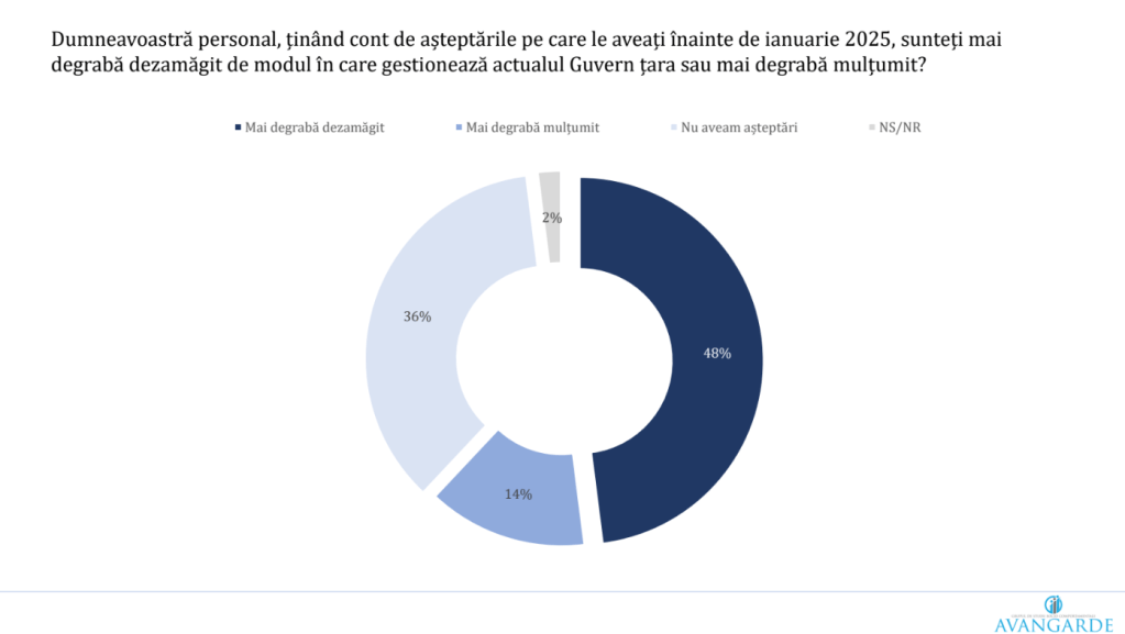 Dintre cei chestionați în sondaj, 48% susțin că sunt mai degrabă dezamăgiți „de modul în care gestionează actualul Guvern țara”. Doar 14% se declară mai degrabă mulțumiți.