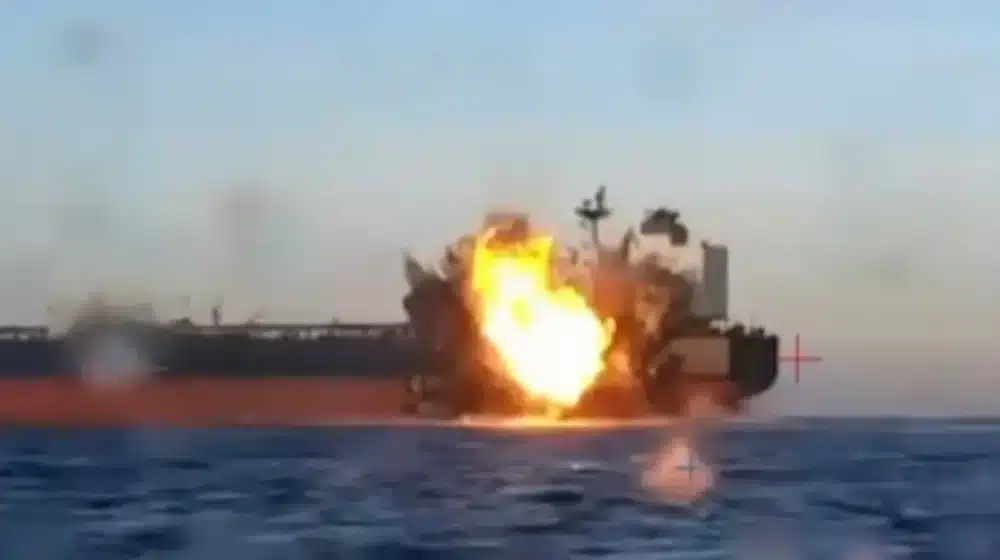 „Căpitanul unui petrolier ancorat raportează că a fost martor și a auzit o explozie puternică pe partea babord, apoi a văzut o ambarcațiune mică părăsind zona. Există ulei în apă care provine dintr-un rezervor de marfă care ar putea avea un impact asupra mediului, nava a luat apă, nu au fost raportate incendii și echipajul este în siguranță și sănătos”, se arată în declarație, relatează și BBC.