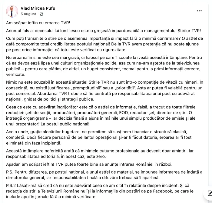 Vlad Pufu a criticat deseori managementul defectuos al TVR.