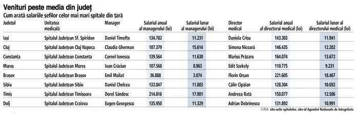 Într-un top al salariilor managerilor celor mai mari spitale din România, realizat de către Ziarul Financiar în februarie 2024, niciunul nu depășea suma de 17.901 de lei (cazul lui Dorel Săndesc, la acel moment managerul Spitalului Clinic Județean de Urgență Timișoara). Dar cele mai multe salarii ale managerilor de spitale mari din România se învârteau în jurul sumei de 11-12.000 de lei net lunar.