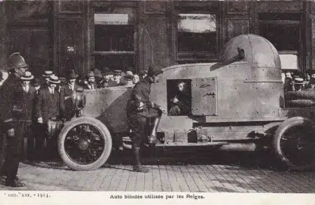 Unele dintre primele versiuni ale mașinilor blindate belgiene au fost construite până în octombrie 1914, inclusiv turelă S.A.V.A. Se spune că acest pas ar fi fost adus de opinia publică în Belgia după ce echipajul distins al unei mașini blindate neeficace comandat de prințul Baudouin de Ligne, fusese ucis în timpul unei misiuni de distrugere a unui pod în spatele liniilor germane. Îmbunătățirea închiderii mașinii și a adăugării unei turele a fost, în orice caz, una logică și aceeași linie de dezvoltare a fost urmată și la realizarea mașinilor blindate britanice și franceze din aceeași perioadă.
