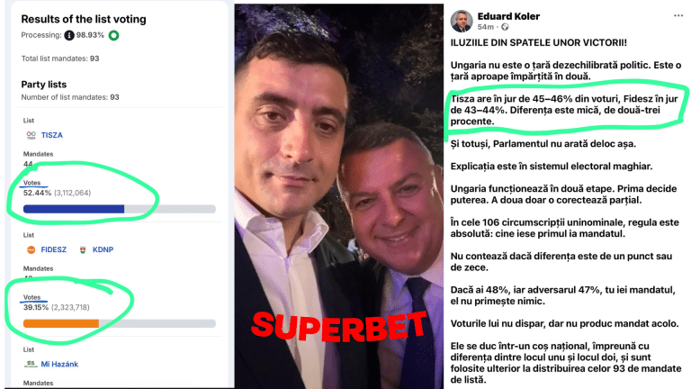Diferența reală între cele două forțe politice este de peste 13 procente și de aproape 800.000 de voturi în favoarea partidului Tisza. Péter Magyar a câștigat clar, net și incontestabil la votul popular. Nu este vorba de nicio „societate împărțită aproape egal”, așa cum vrea să ne facă Koler să credem, ci de o victorie zdrobitoare a opoziției.