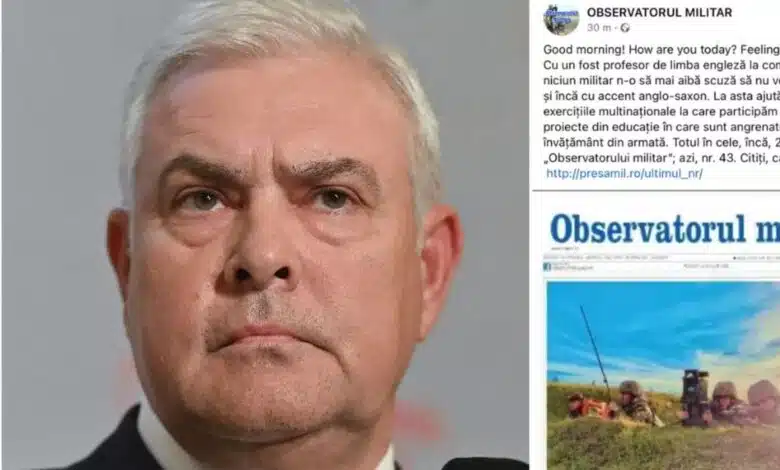 Publicația „Observatorul Militar” scrie, într-o postare publicată miercuri pe contul de Facebook în care-și promovează noul număr, că „niciun militar n-o să mai aibă scuză să nu vorbească engleză și încă cu accent anglo-saxon”, după ce în fruntea armatei a fost numit „un fost profesor de limba engleză”.