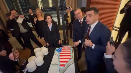 George Simion a tăiat un tort cu Groenlanda, pe care era un steag american, la un eveniment în SUA