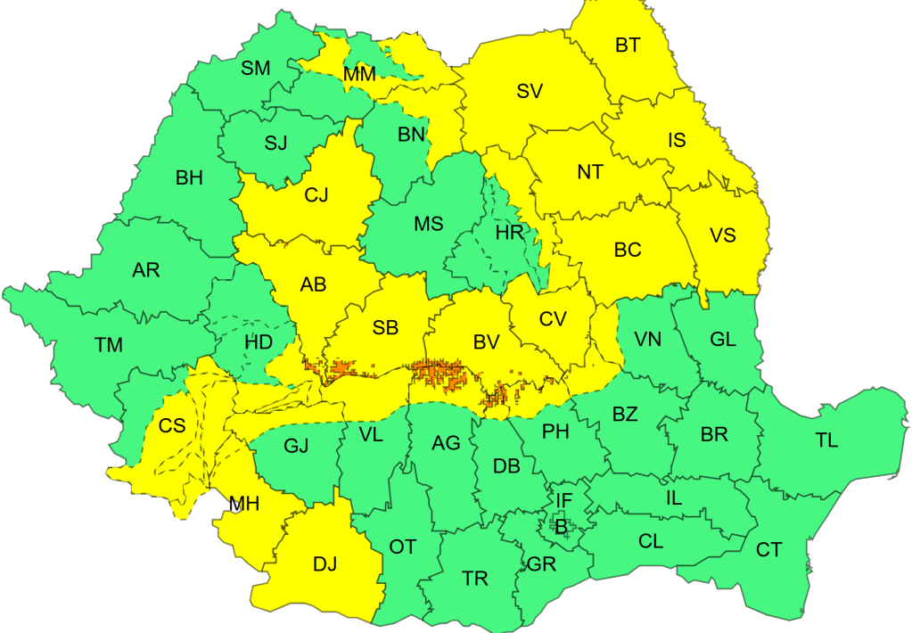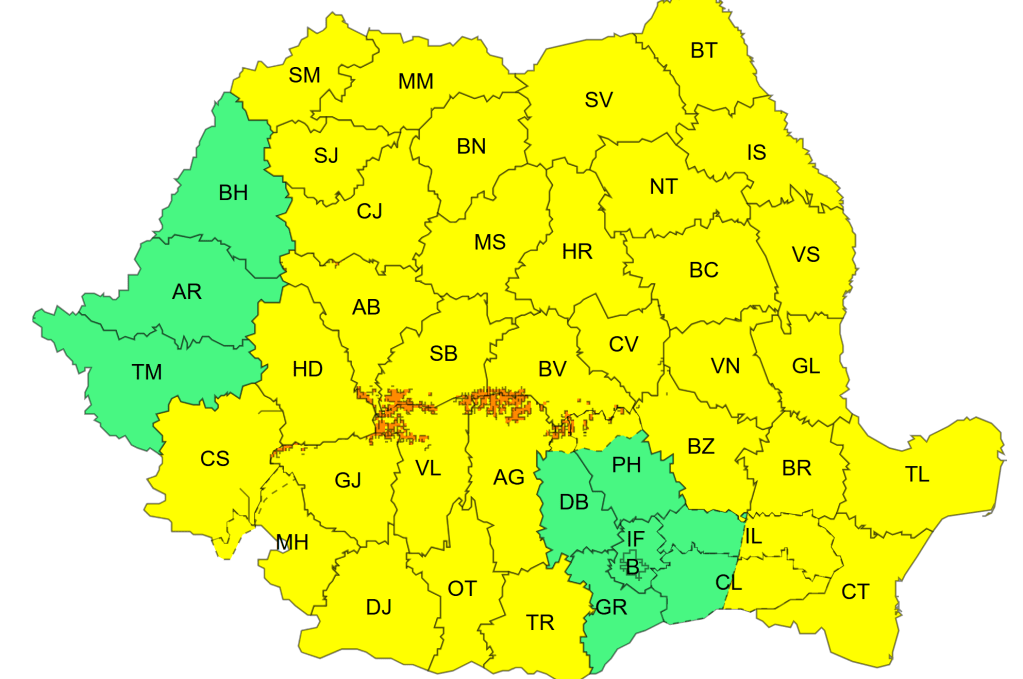 De asemenea, de mâine, de la ora 10.00 și până seara, la ora 21.00, intră în vigoare alte două coduri galben și portocaliu de vânt și ninsori viscolite la munte.